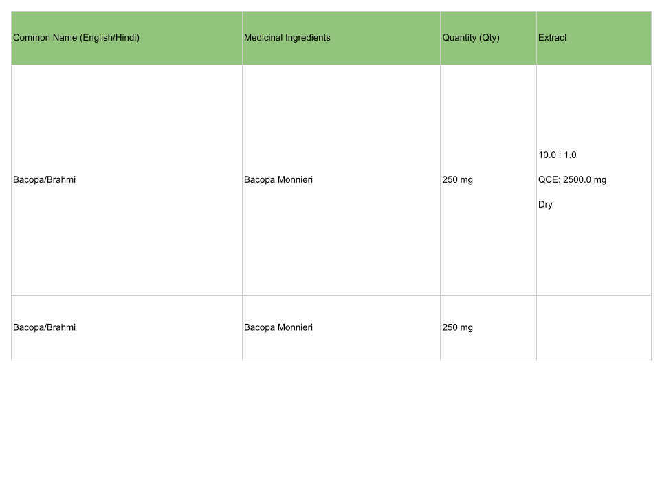 | Bacopa/Brahmi | Bacopa Monnieri | 250 mg | 10.0 : 1.0 QCE: 2500.0 mg Dry |