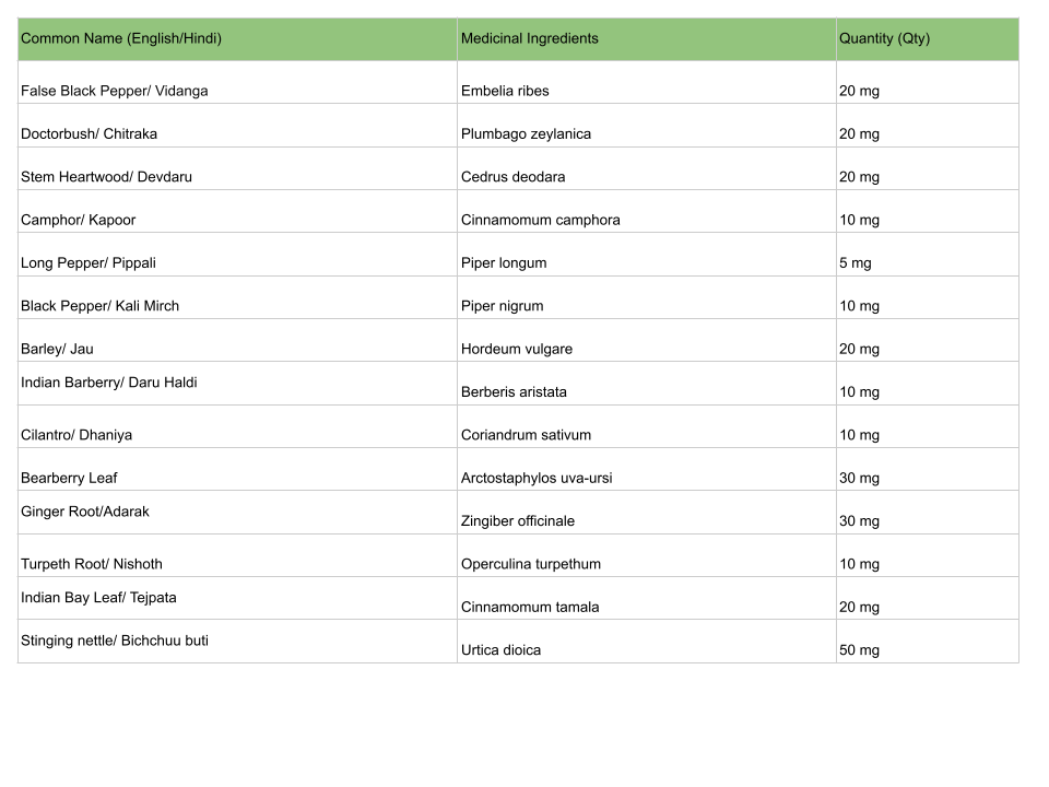 | Common Name (English/Hindi) | Medicinal Ingredients | Quantity (Qty) |