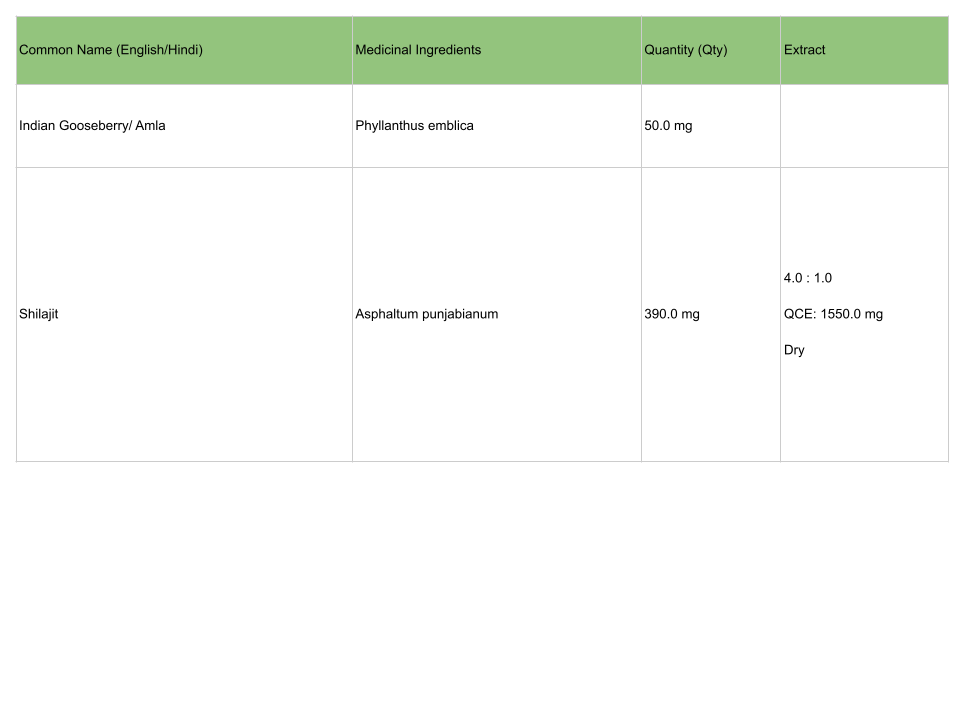 | Shilajit | Asphaltum punjabianum | 390.0 mg | 4.0 : 1.0 QCE: 1550.0 mg Dry |