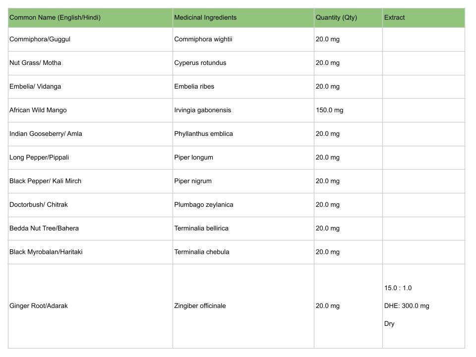 | Common Name (English/Hindi) | Medicinal Ingredients | Quantity (Qty) | Extract |