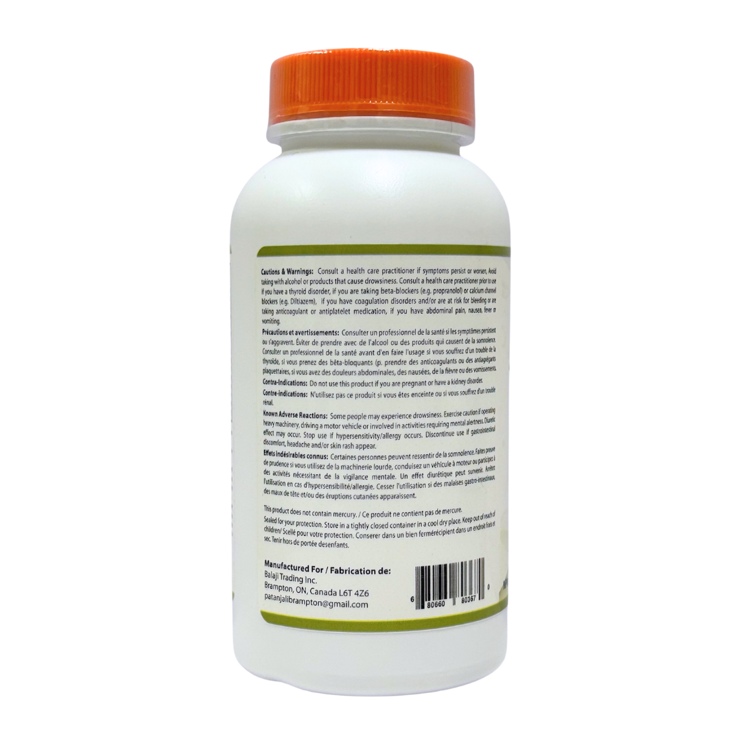 Consult a health care practitioner if symptoms persist or worsen. Avoid taking with alcohol or products that cause drowsiness. Consult a health care practitioner prior to use if you have a thyroid disorder, if you are taking beta-blockers (e.g. propranolol) or calcium channel blockers (e.g. Diltiazem), if you have coagulation disorders and/or are at risk for bleeding or are taking anticoagulant or antiplatelet medication, if you have abdominal pain, nausea, fever or vomiting.