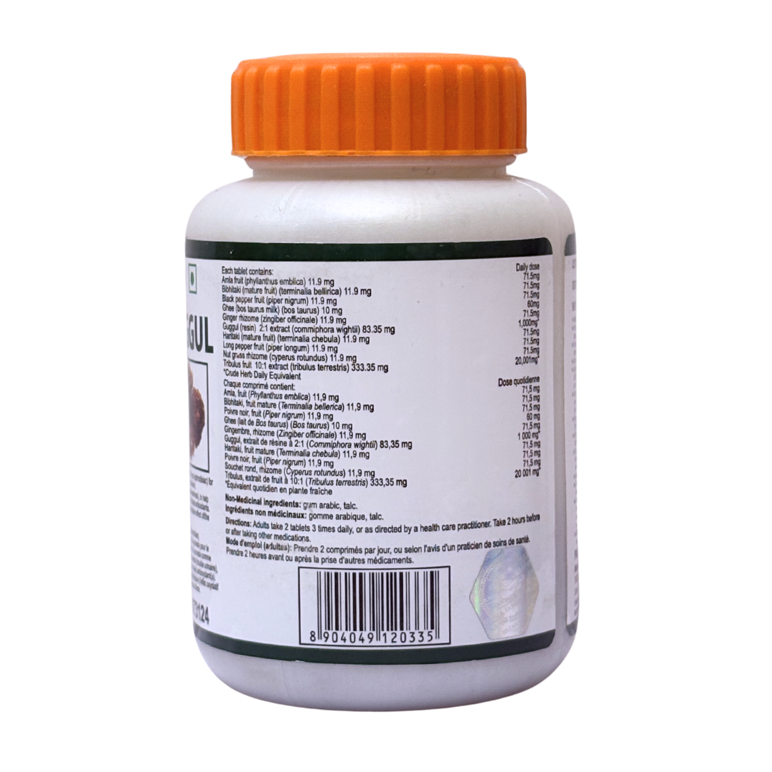 Divya Gokshuradi Guggul is formulated with Tribulus (Gokshura). In Ayurvedic medicine, Tribulus is traditionally used as a Mutrala (diuretic) to help relieve minor urinary tract inflammations and difficult or painful urination (Mutrakrcchra), and to help relieve symptoms associated with Prameha (urinary disorder). It is also traditionally used to help relieve Arsa (haemorrhoids), coughs (Kasa), and as a Brmhana (nutritive tonic) in cases of general weakness (Daurbalya). Additionally, it is traditionally used as a Vrsya (aphrodisiac) for men. This product provides antioxidants that help protect cells against oxidative damage caused by free radicals